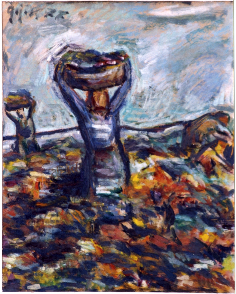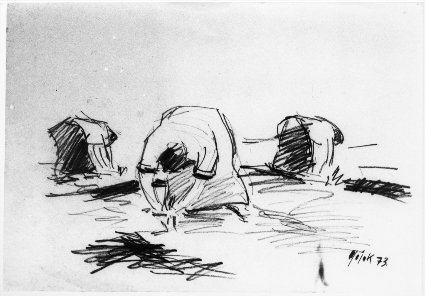 Kompozicija Kiša predstavlja još jednu u nizu Gojakovih uspješnih interpretacija vremenskih mijena, no par pod kabanicom postavljen u desni donji kut prednjeg plana, čini ovaj prikaz i zanimljivom žanr-scenom. Njihov ulazak u kadar umjetniku postaje vrijedna, gotovo dramatska nadogradnja prikazu, jer njihov bijeg pred kišom razbija očekivanu dosadu kišne atmosfere. No, likovna dimenzija kompozicije nije niša manje razigrana. Statičan, razvučen i horizontalan krajolik zavičajne rive okupan kišom, dinamiziran je vertikalno postavljenim linijama kapi kiše u jačanju. Na ovaj način ostvarena je napetost momenta u kojem bez odgode treba potražiti zaklon pred sve jačom kišom. Svakodnevnica koja je zaokupljala Gojaka bila je ispunjena i radom, uglavnom onim teškim fizičkim od kojeg, kako nam svjedoče dva iduća platna, nisu bile izuzete ni žene. Jematva, kao i Beračice, djela su koja svako na svoj način čini Gojakovu stvaralačku pohvalu ljudskom radu. Kompozicija Jematva nevelika je žanr scena nadahnuta okruženjem vinograda koji su za Gojakova života još bili rasprostranjeni bikovskim podacima poviše Makarske. Jematvu, težak i zahtjevan posao koji predstavlja krunu cjelogodišnjeg mukotrpnog rada u vinogradu obavljaju žene. Okosnicu kompozicije čini monumentalni ženski lik, koji izvirući iz bujnog šarenila vinograda u niskom prednjem planu, poprima obrise spomenika postavljenog na plavetnilu horizonta. Jednako su monumentalni i likovi pognutih beračica na istoimenom crtežu. Ovaj crtež mogao bi predstavljati i beračice matra, mediteranske biljke i omiljene delicije ranog ljeta Makarana Gojakova doba. Čvrsta kompozicija ovog crteža zaokružene je crtačke teksture, a snažnu mu dominatu čini voluminoznost likova ostvarena dosljedno građenom grafičkom modelacijom.