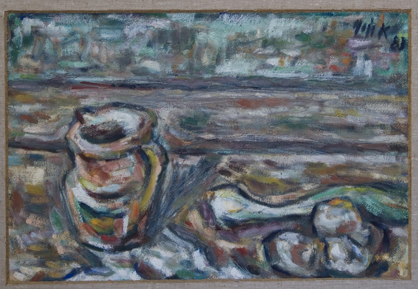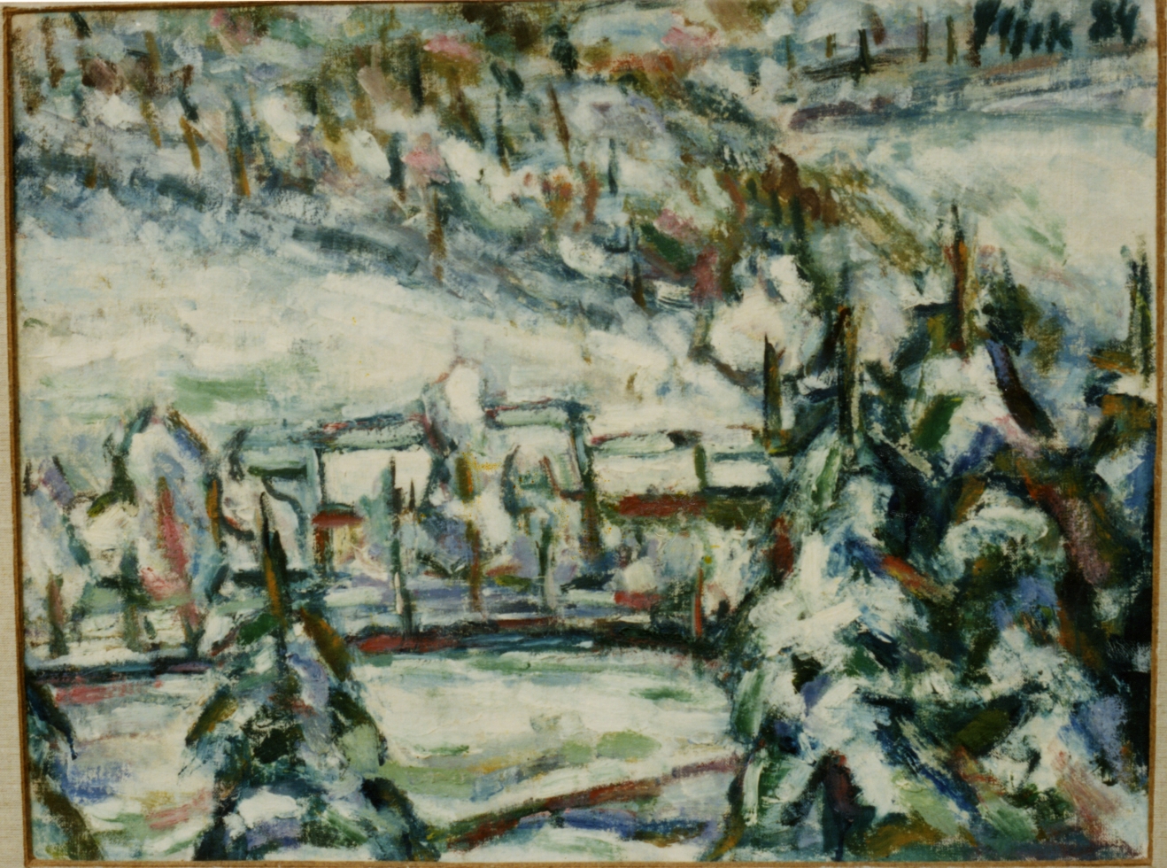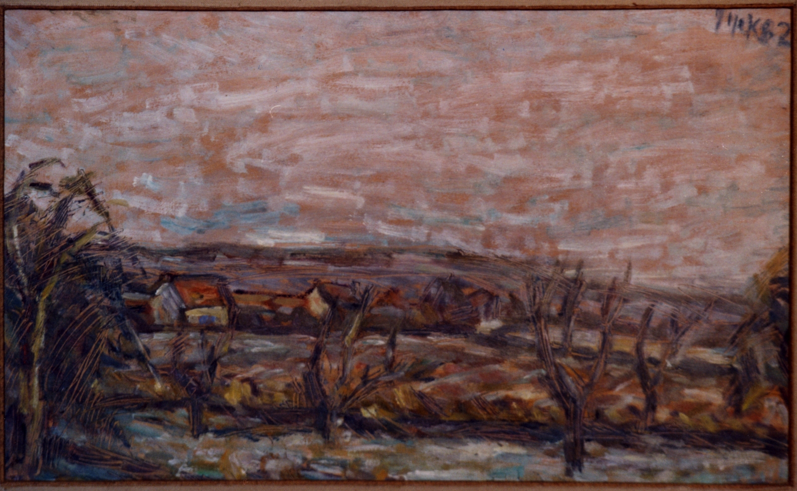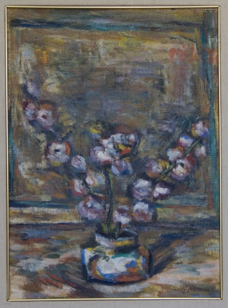 Nasuprot ekspresivnoj dramatici Majskog burnog dana stoji gotovo idilični mir kompozicije Masline pod Biokovom. Ovo je još jedno zapaženo djelo iz fundusa Galerije. Gradeći ga bez suvišnih akcenata umjetnik je uspio naglasiti surovu elementarnost zavičajne planine koja svojom pojavnošću postaje makarska reminiscencija mitske planine Sainte-Victoire. Razigrana stabla maslina u prvom planu predstavljaju pitomo okruženje topline i života, dok strogo izvedena kontura Biokova razgraničava dva makarska horizonta, kameni i, onaj nebeski.