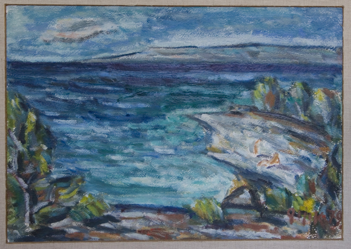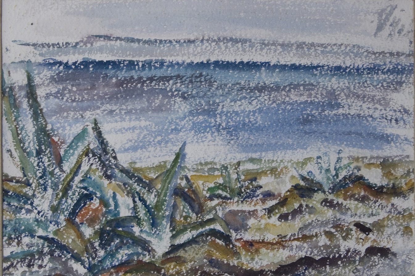 Stvaralačka priča drugačije profilirane sadržajnosti nazire u akvarelu Aloji. Sami aloji postaju njeni protagonosti. Smješteni su u lijevom kutu prvog plana i gotovo oživljeni. Zaogrnuti su , kao i cjela kompozicija, koprenom ljetne omare. Ovi stameni promatrači ljepote, živi i puni opore snage, gotovo zadivljeni traju pred zavičajnom vizurom iskonskog zagrljaja kopna i mora.
